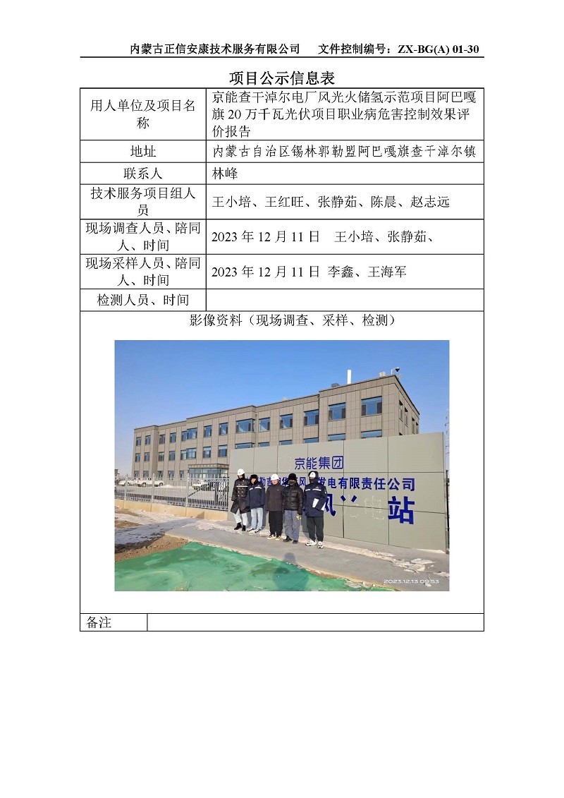 京能查干淖爾電廠風(fēng)光火儲(chǔ)氫示范項(xiàng)目阿巴嘎旗20萬千瓦光伏項(xiàng)目職業(yè)病危害控制效果評(píng)價(jià)公示