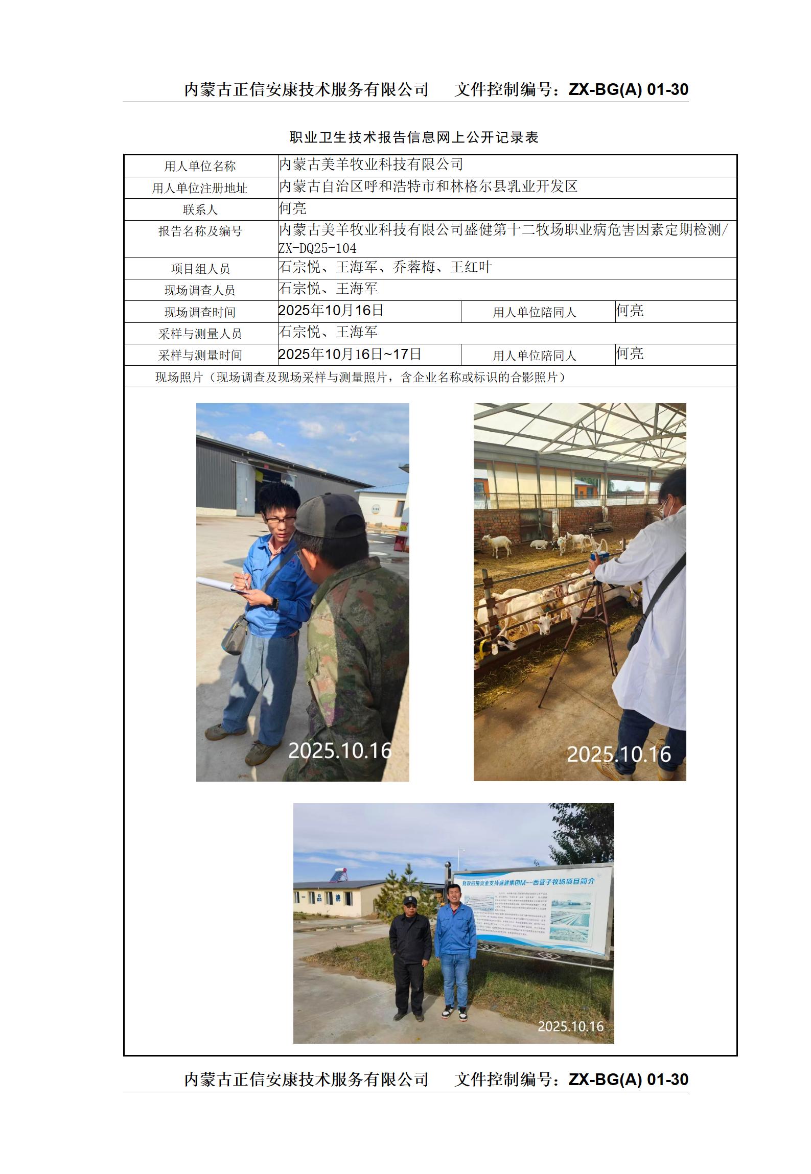 內(nèi)蒙古美羊牧業(yè)科技有限公司盛健第十二牧場職業(yè)病危害因素定期檢測
